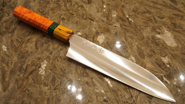 This special work of art is the brain child of newly award Master Sword Smith Yasha Yakuwa and The Master Sharpener himself Shibata-San. Yakuwa-San and Shibata-San, spent 4 days heating iron ore, using coal. This process is the traditional way of making Tamahagane Steel. Tamahagane Steel dates back to over 6,000 BCE. 3 knives were made as a collab, more so a fun project. A nakiri, A santoku, and A 210mm Gyuto. They were Forged and heat treated by Yakuwa-San. Shibata-San did his thing grinding, profiling, and sharpening. This is your only opportunity to own a knife this rare.