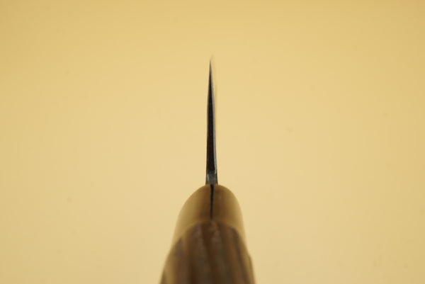 He hand laminates and hand finishes all of the knives he makes. All knives are water quenched. The heat treat is absolutely amazing. Many people say they cut as well as Shigefusa and Kato. Fit and finish are not his thing his focus is solely on making a knife perform to the best of his ability. These knives can take a beating, they are built strong and can handle all day use. To be honest at the price point these knives are at it is simply unheard of to have a completely handmade blade, especially one that performs so well.