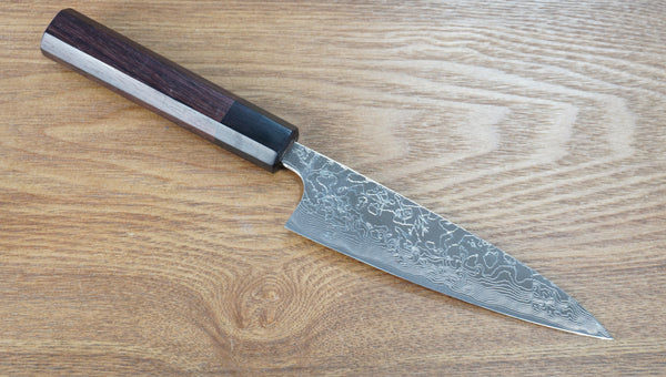 Saji-san makes this line from R2 powdered steel. These polished silver damascus knives are often called diamond damascus because of the raised texture and shine in thew light. They are thin, sharp, hold an edge incredibly well, and shine bright like a diamond. These are truly one of the most beautiful eye catching knives i have seen in a long time.