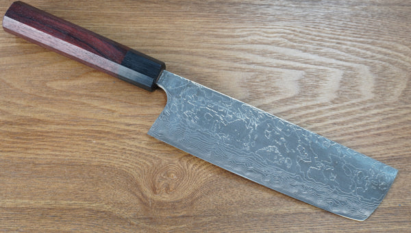 Saji-san makes this line from R2 powdered steel. These polished silver damascus knives are often called diamond damascus because of the raised texture and shine in thew light. They are thin, sharp, hold an edge incredibly well, and shine bright like a diamond. These are truly one of the most beautiful eye catching knives i have seen in a long time.
